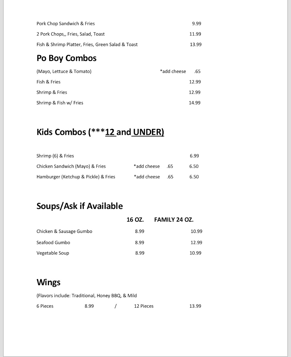 “ We enjoyed our freshly cooked shrimp & fish poboys, daily special of fish & white beans, kids burger & kids shrimp. Claudia cooked it all & was so friendly. NOTE- prices have changed slightly from posted menu. ”